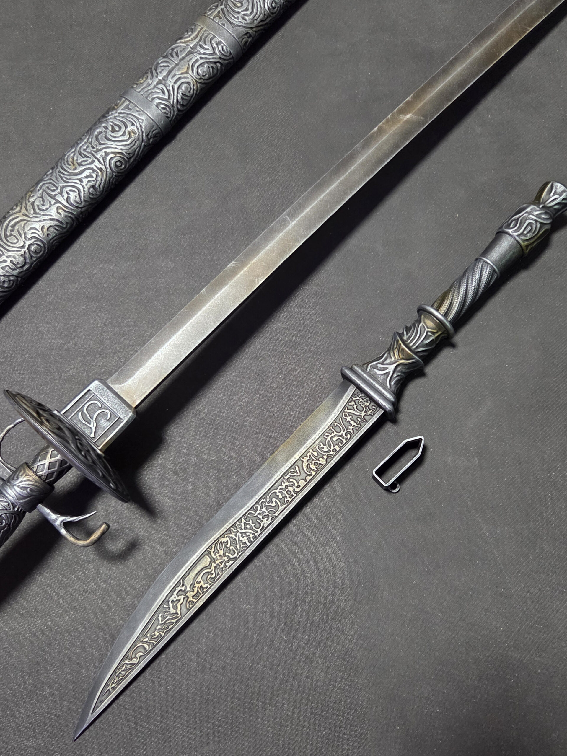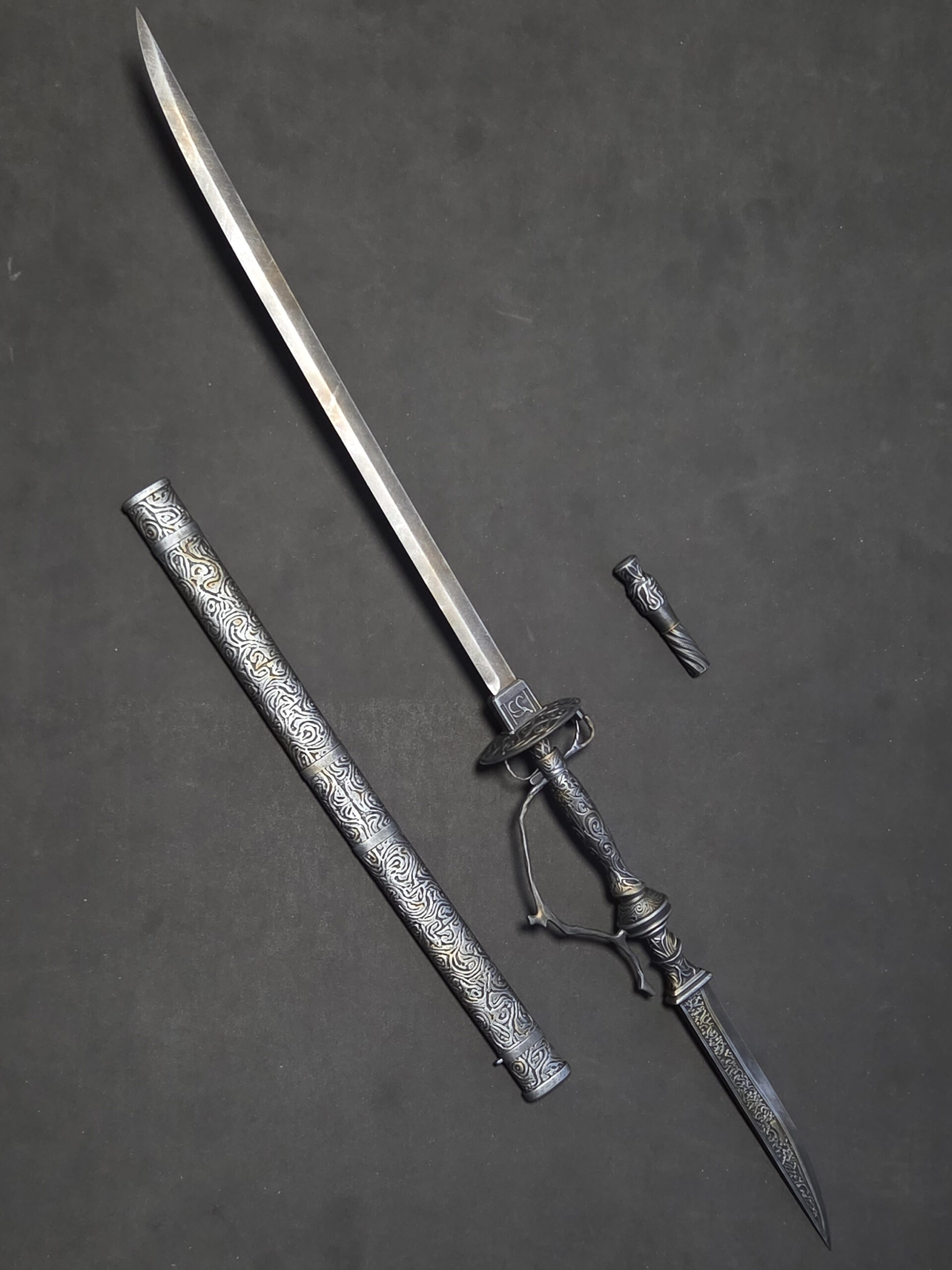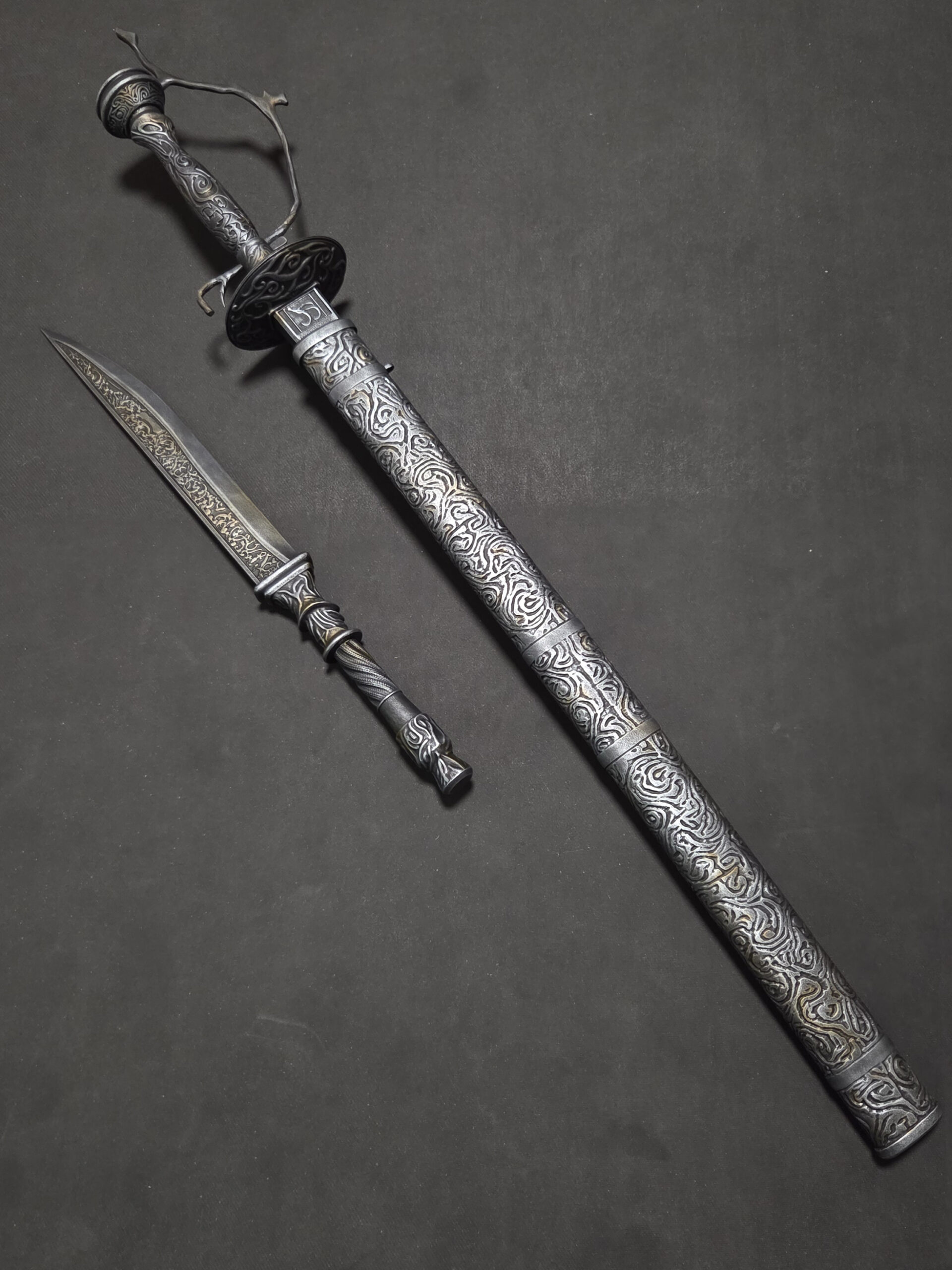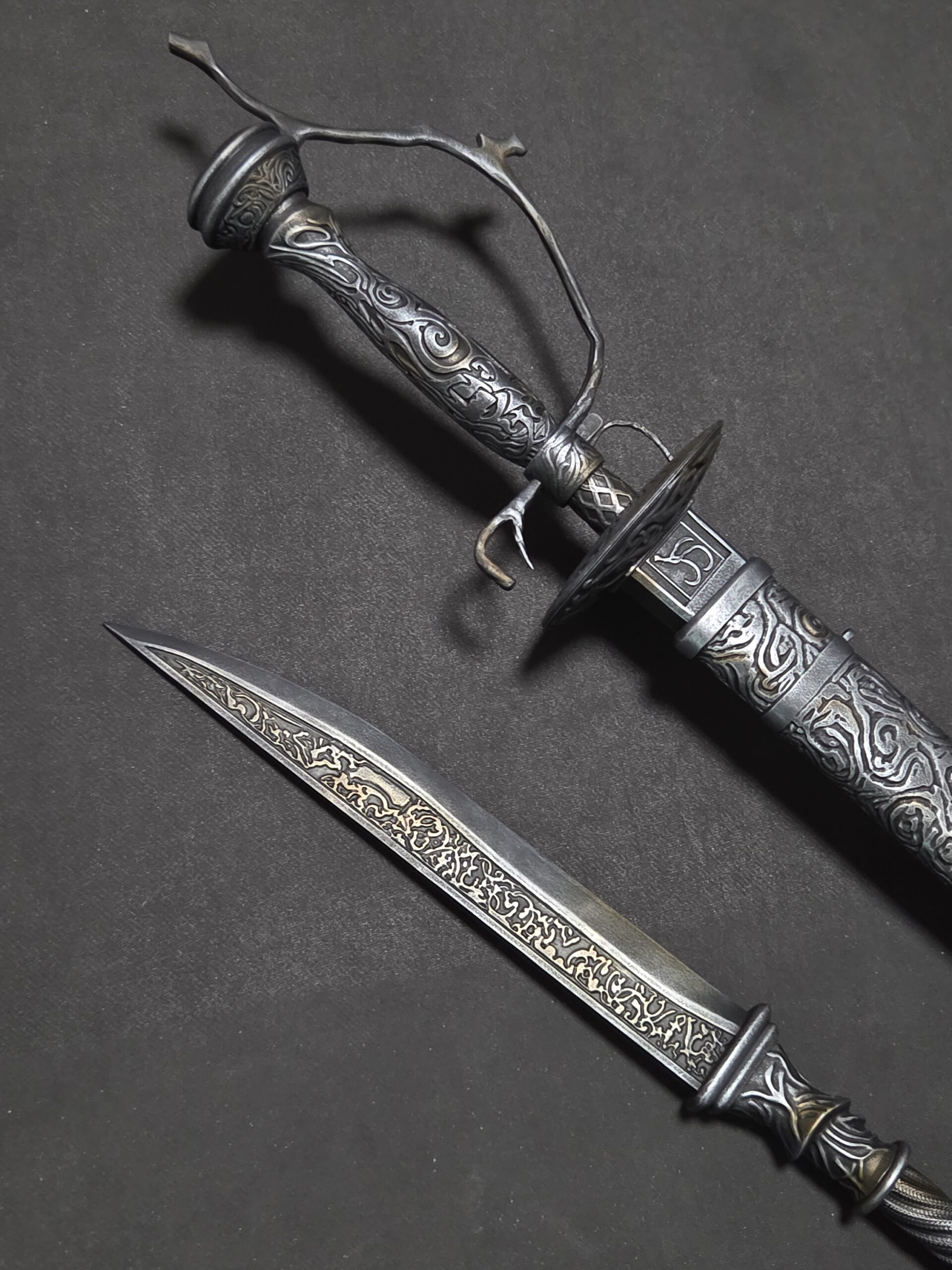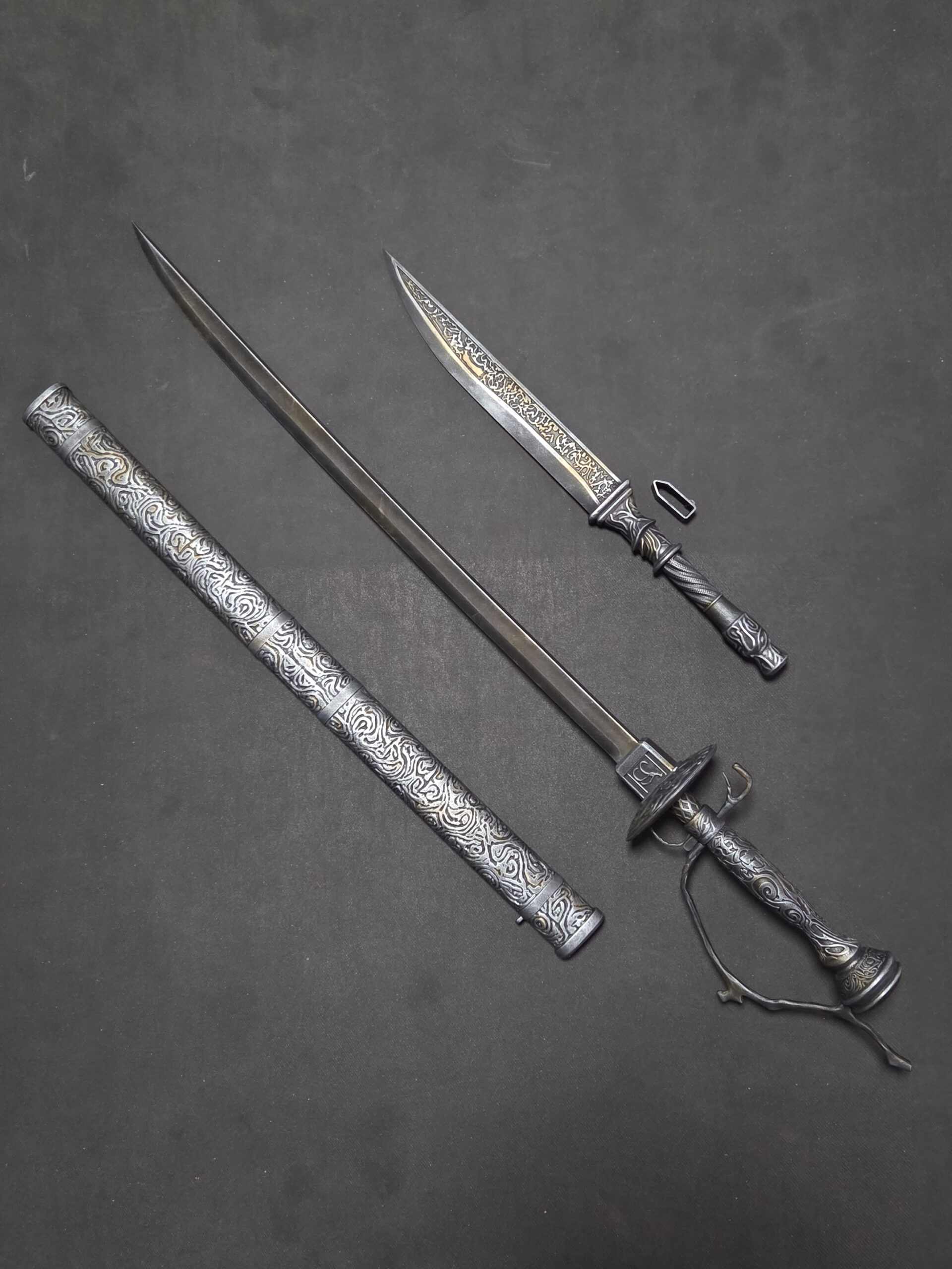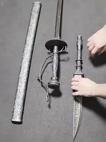 The dagger features a removable handle and an internal reinforcement rod, allowing it to be securely inserted into the sword.