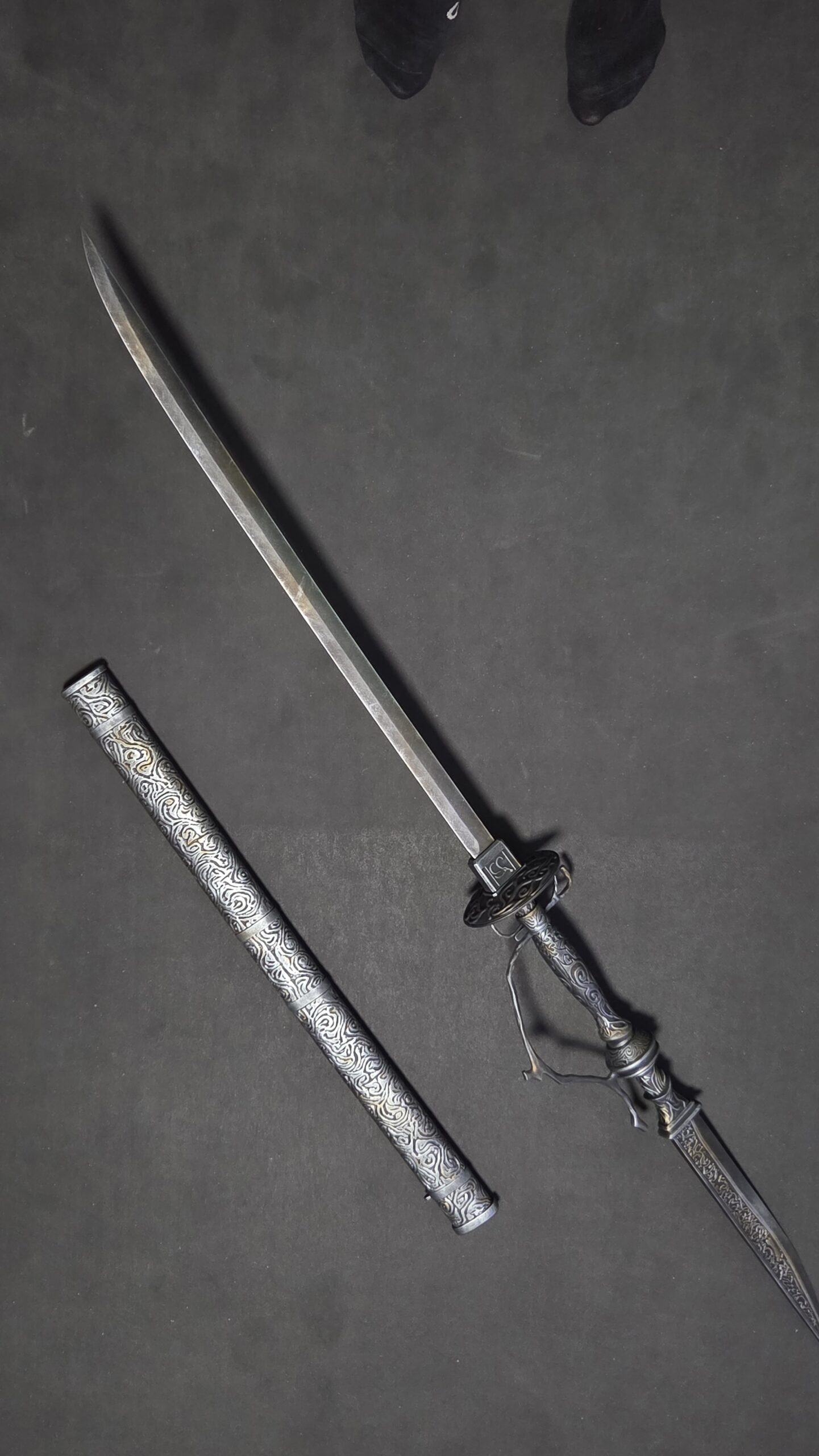This is a handcrafted Rakuyo replica with scabbard, inspired by Lady Maria’s weapon from Bloodborne. The set recreates the iconic transforming design, combining a slender sword and detachable dagger into one elegant cosplay and display piece.