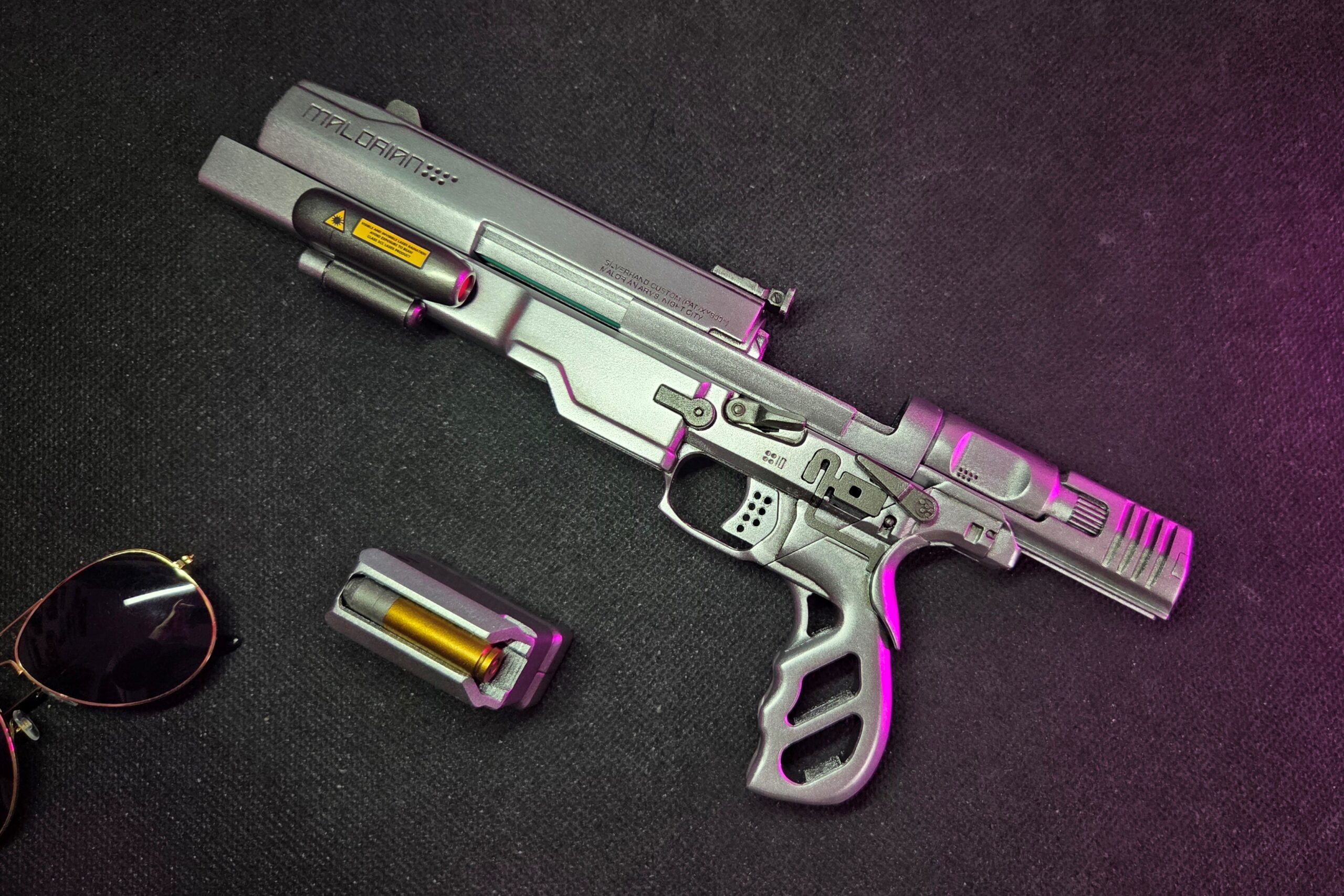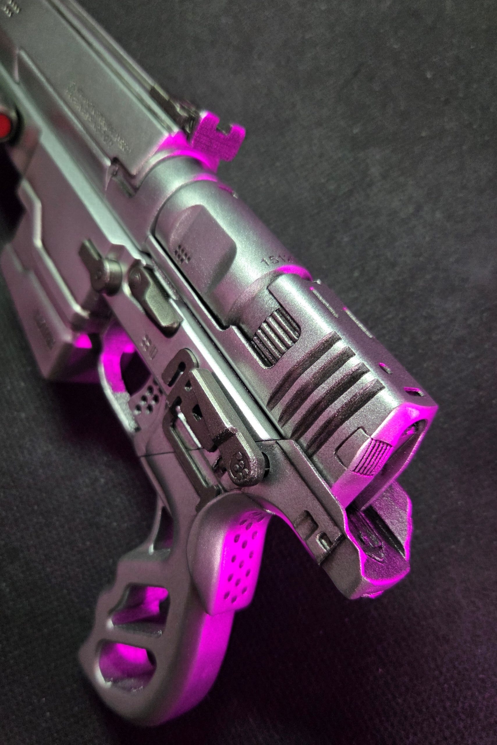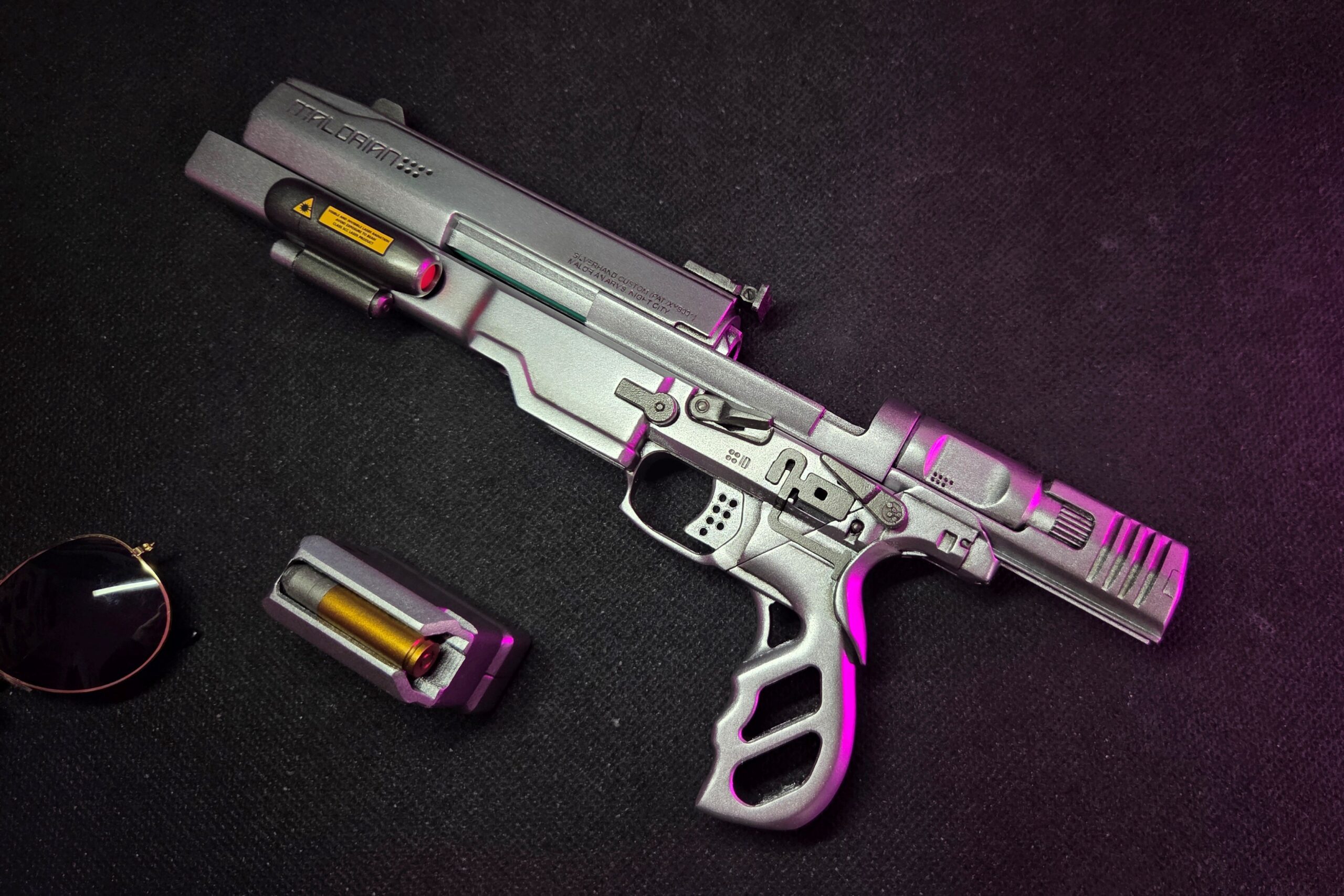 The most technically advanced 1:1 replica of Johnny Silverhand’s legendary sidearm. This Malorian Arms 3516 features unique mechanical action, including a 2-stage sliding bolt, a removable magazine with a functional release, and a spring-loaded trigger. Crafted from high-grade ABS, meticulously hand-sanded, and finished with professional oils and acrylics for a perfect battle-worn metal look. The ultimate piece for every Night City merc.