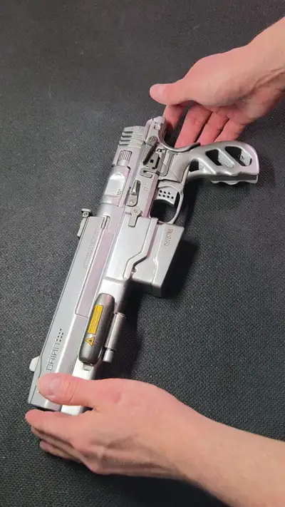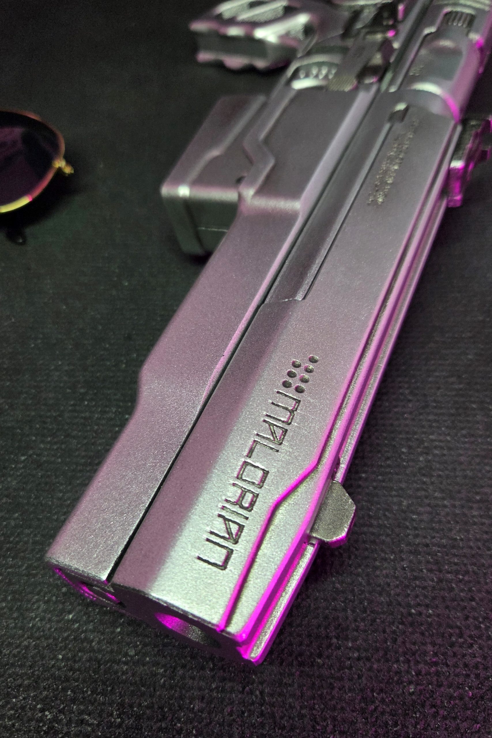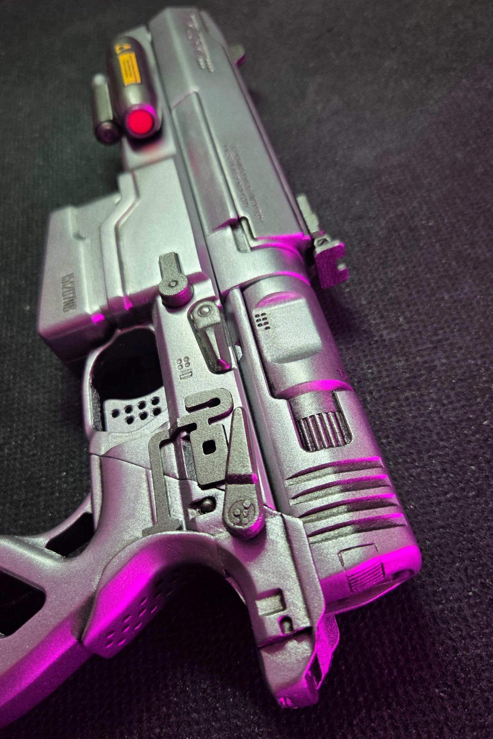 The most technically advanced 1:1 replica of Johnny Silverhand’s legendary sidearm. This Malorian Arms 3516 features unique mechanical action, including a 2-stage sliding bolt, a removable magazine with a functional release, and a spring-loaded trigger. Crafted from high-grade ABS, meticulously hand-sanded, and finished with professional oils and acrylics for a perfect battle-worn metal look. The ultimate piece for every Night City merc.