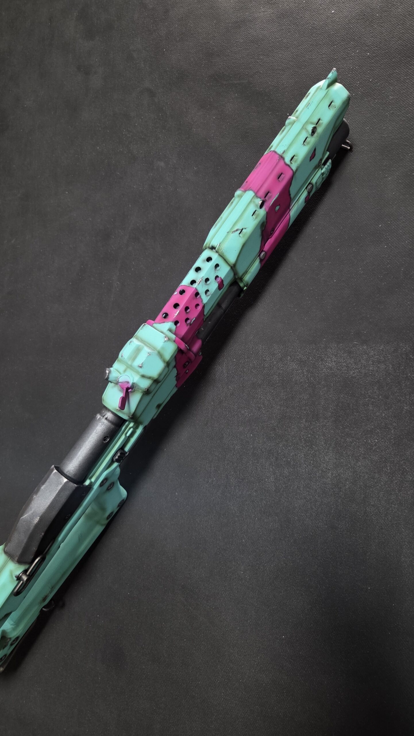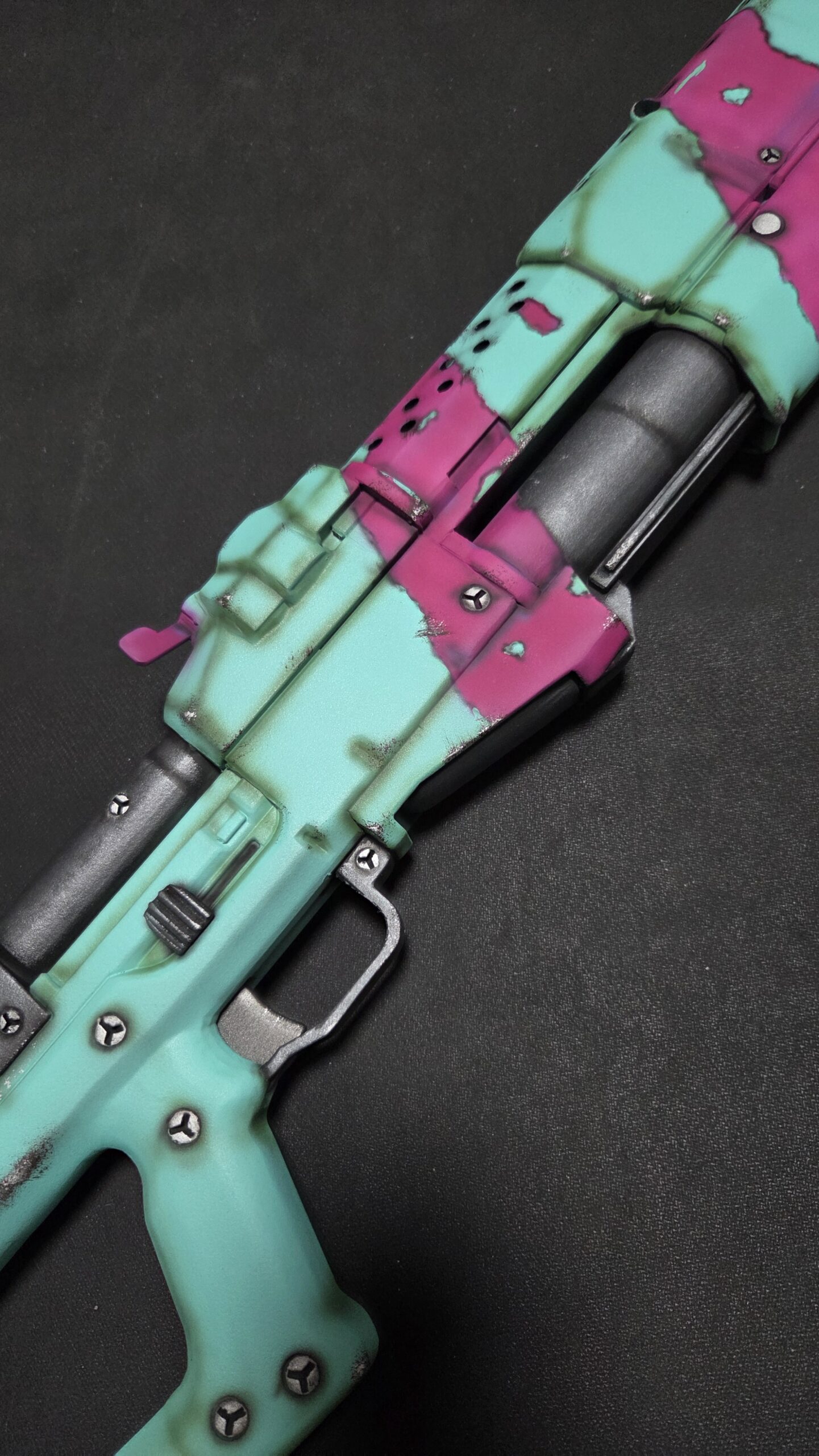 The exterior is 3D printed using high-grade ABS+ plastic. This material was chosen for its superior strength and heat resistance compared to standard PLA. Every component is heavily sanded to remove print lines, then primed and hand-painted. We use high-quality acrylics to achieve the vibrant cyan-mint and magenta contrast, finished with weathering effects to make it look like it just survived a shootout at Arasaka Tower.
