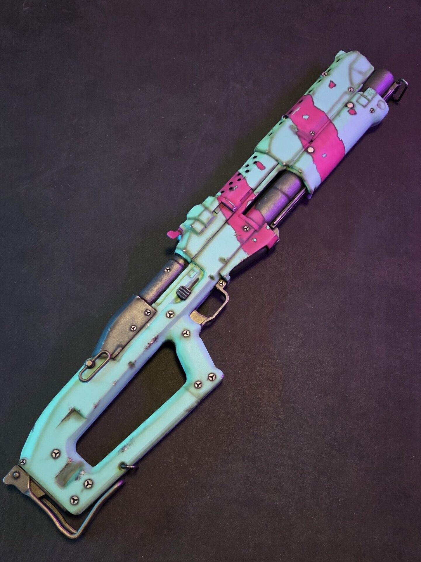 Dominate Night City with this 1:1 scale Rebecca’s GUTS Shotgun. Inspired by the chaotic energy of Rebecca from Cyberpunk: Edgerunners, this 85cm monster is built for impact. Featuring a heavy-duty internal pipe core, moving trigger, and the signature neon cyan and magenta “Carnage” paint job, it’s the ultimate centerpiece for any Cyberpunk cosplay or collection.