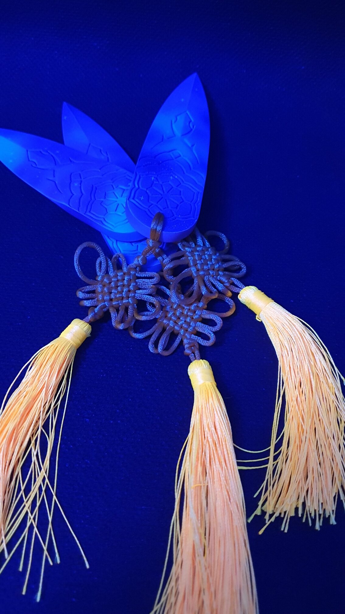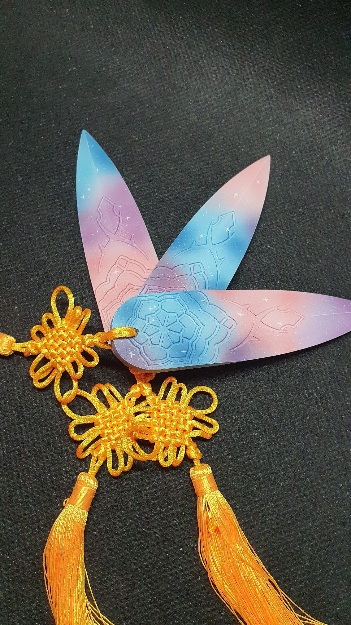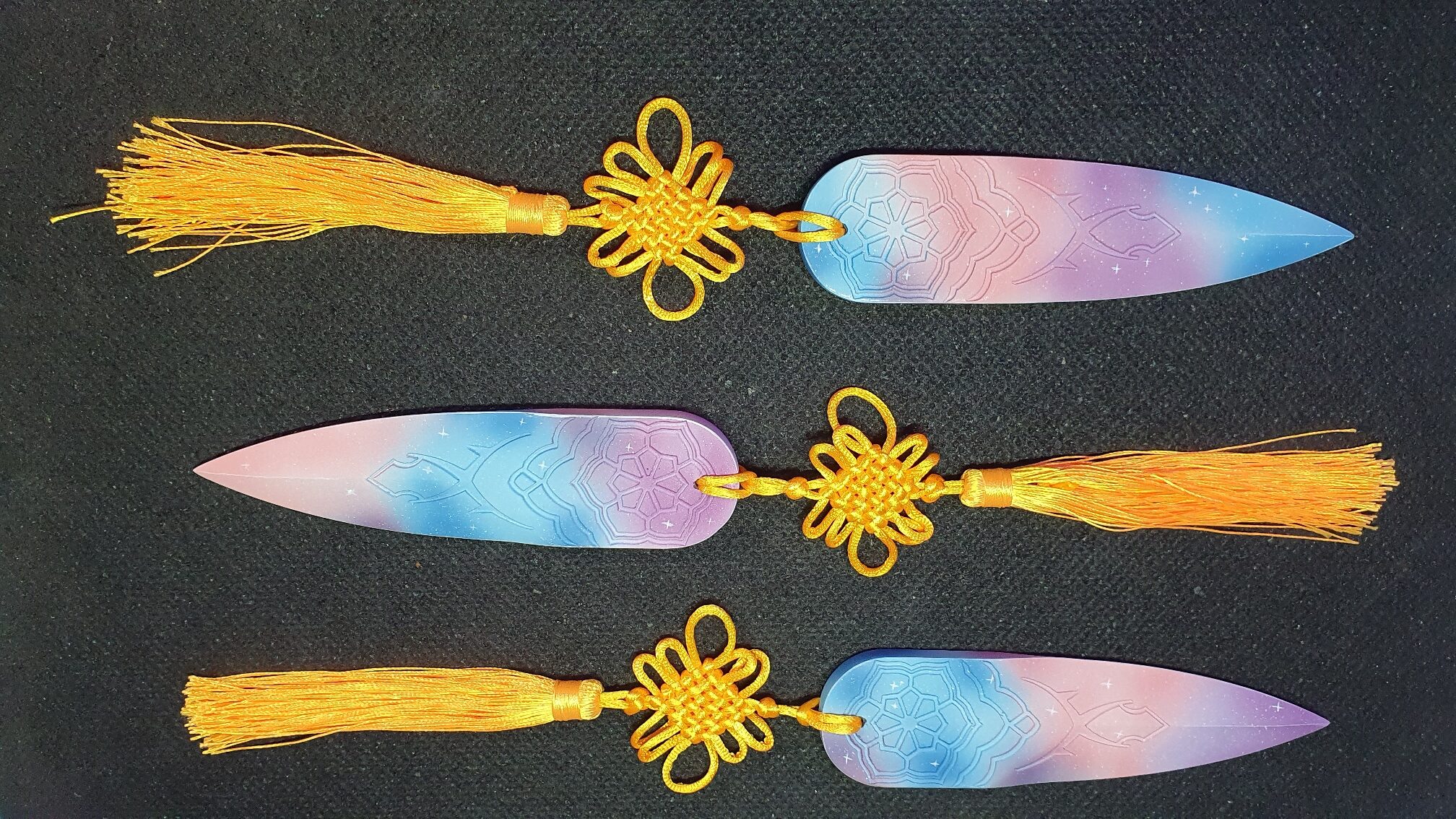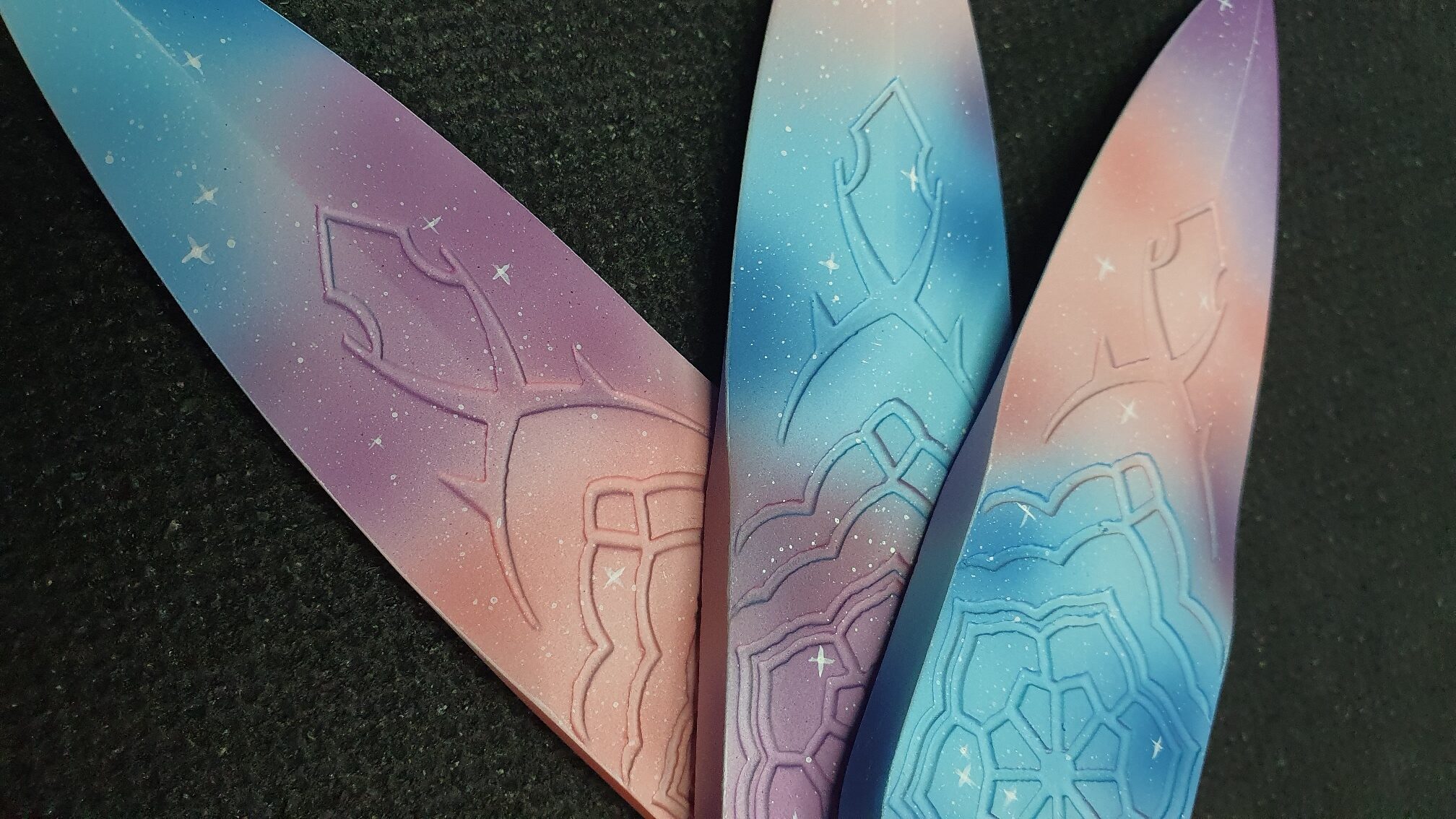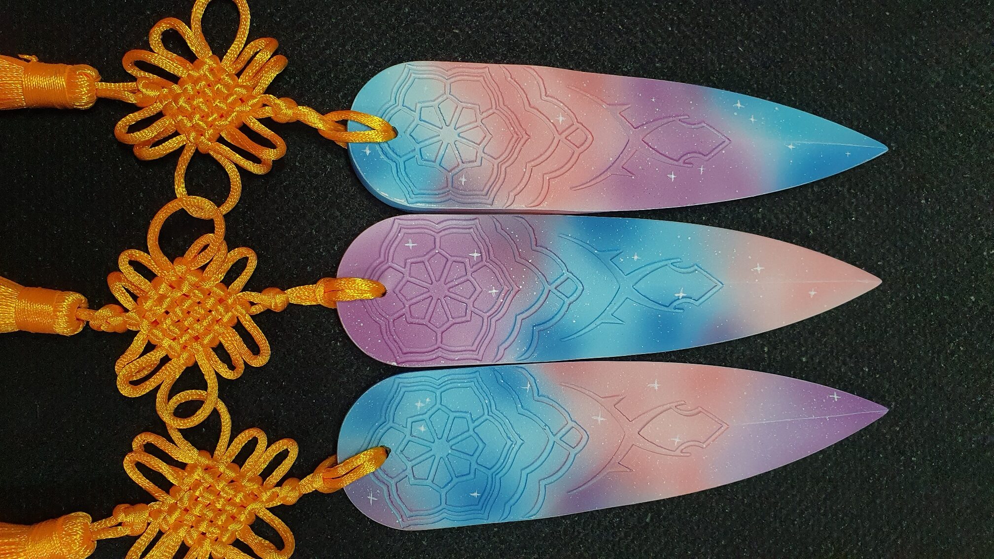 This hand-painted Kunai prop is inspired by the KPOP Demon Hunters concept, blending traditional ninja aesthetics with bright pastel fantasy colors.